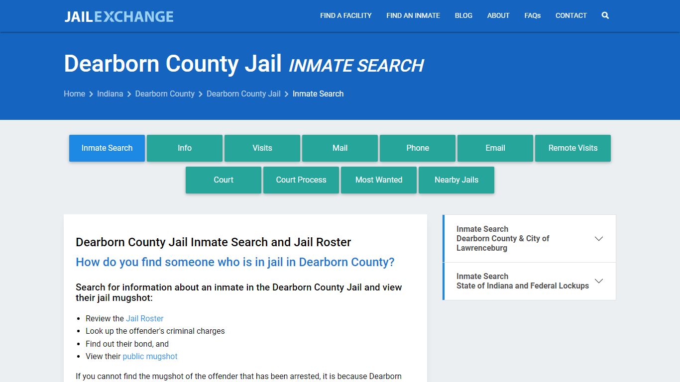 Dearborn County Jail Inmate Search Dearborn County Dearborn County Jail Look up the offender's criminal charges Lawrenceburg, IN 47025 Attention: Media Relations - Inmate Mugshot Request Mail, click on the link below, or call the facility at For inmate services and facility information such as: 812-537-8719 Physical Address: Lawrenceburg, IN 47025